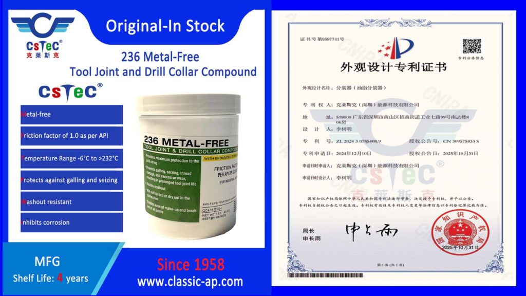 On April 24th, 2026, CsTeC launched CsTeC 236 Deepwater High Temperature Metal-Free Tool Joint and Drill Collar Compound. CsTeC 236 Deepwater High Temperature Metal-Free Tool Joint and Drill Collar Compound provides maximum protection to the drill string. CsTeC 236 Deepwater High Temperature Metal-Free Tool Joint and Drill Collar Compound prevents galling, seizing, thread damage, and excessive wear resulting in prolonged tool joint and drill collar life. This non contaminating tool joint and drill collar compound resists washout and will not harden or dry out in the connection. CsTeC 236 Deepwater High Temperature Metal-Free Tool Joint and Drill Collar Compound is a metal-free tool joint and drill string compound which enables ease of makeup and breakout of all joints and provides the required thread and shoulder protection under various operating conditions. The absence of metals and presence of corrosion inhibitors make CsTeC 236 Deepwater High Temperature Metal-Free Tool Joint and Drill Collar Compound a superior tool joint and drill collar compound. It is an environmental alternative to compounds which contain metals such as zinc or copper.