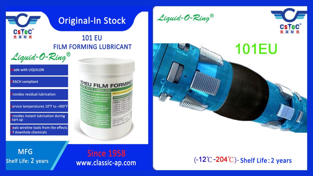 101EU is recommended for use on O-rings, seal nipples, gaskets, packer plugs, and other downhole tool accessories to ensure against drying, cracking, and downhole contamination.101EU is also recommended for application to wireline equipment and various downhole tools, where lubrication and corrosion resistance are vital. This lubricant will allow easy break-out and disassembly of downhole tools that have been subjected to adverse downhole chemicals.