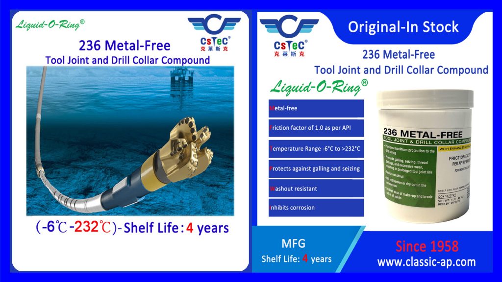 Liquid-O-Ring 236 Metal-Free Tool Joint and Drill Collar Compound provides maximum protection to the drill string. 236 prevents galling, seizing, thread damage, and excessive wear resulting in prolonged tool joint and drill collar life. This non-contaminating tool joint and drill collar compound resists washout and will not harden or dry out in the connection. 236 is a metal-free tool joint and drill string compound which enables ease of makeup and breakout of all joints and provides the required thread and shoulder protection under various operating conditions. The absence of metals and presence of corrosion inhibitors make 236 a superior tool joint and drill collar compound. It is an environmental alternative to compounds which contain metals such as zinc or copper.