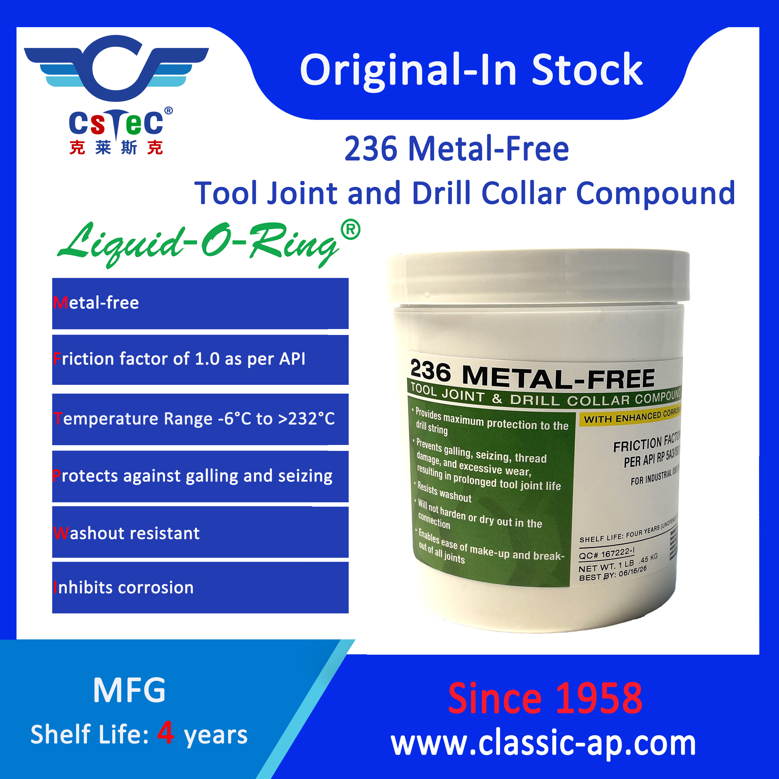 Liquid-O-Ring 236 Metal-Free Tool Joint and Drill Collar Compound provides maximum protection to the drill string. Liquid-O-Ring 236 prevents galling, seizing, thread damage, and excessive wear resulting in prolonged tool joint and drill collar life. This non contaminating tool joint and drill collar compound resists washout and will not harden or dry out in the connection. Liquid-O-Ring 236 is a metal-free tool joint and drill string compound which enables ease of makeup and breakout of all joints and provides the required thread and shoulder protection under various operating conditions. The absence of metals and presence of corrosion inhibitors make Liquid-O-Ring 236 a superior tool joint and drill collar compound. It is an environmental alternative to compounds which contain metals such as zinc or copper.