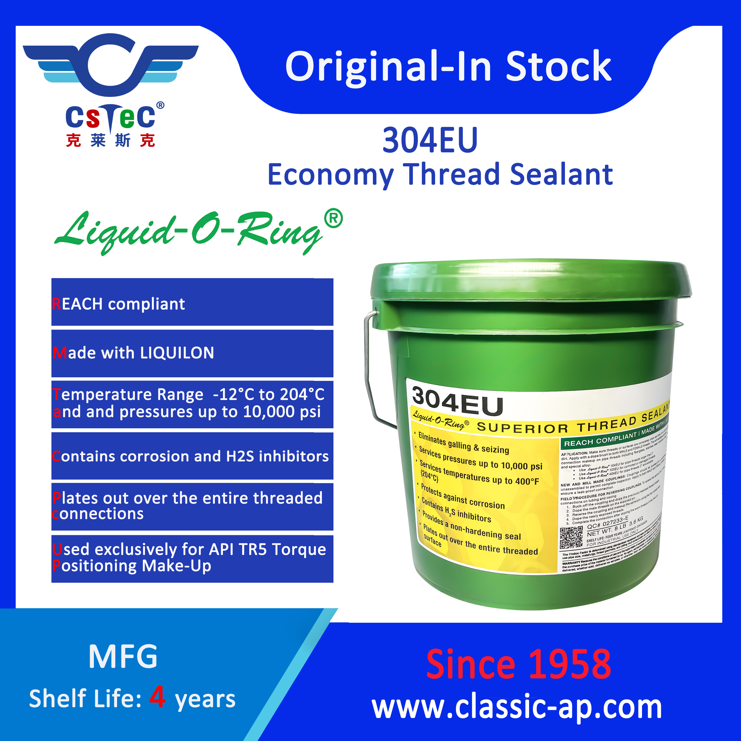 Liquid-O-Ring 304EU Economy Thread Sealant, an economical grade compound, is made with LIQUILON for application to tubing, casing, and large diameter size pipe. It performs well in cold weather applications. Liquid-O-Ring 304EU Economy Thread Sealant seals up to 10,000 psi and services temperatures up to 400°F (204°C). Liquid-O-Ring 304EU is used exclusively for API TR5 Torque Positioning Make-Up.Liquid-O-Ring 304EU Economy Thread Sealant may be used as