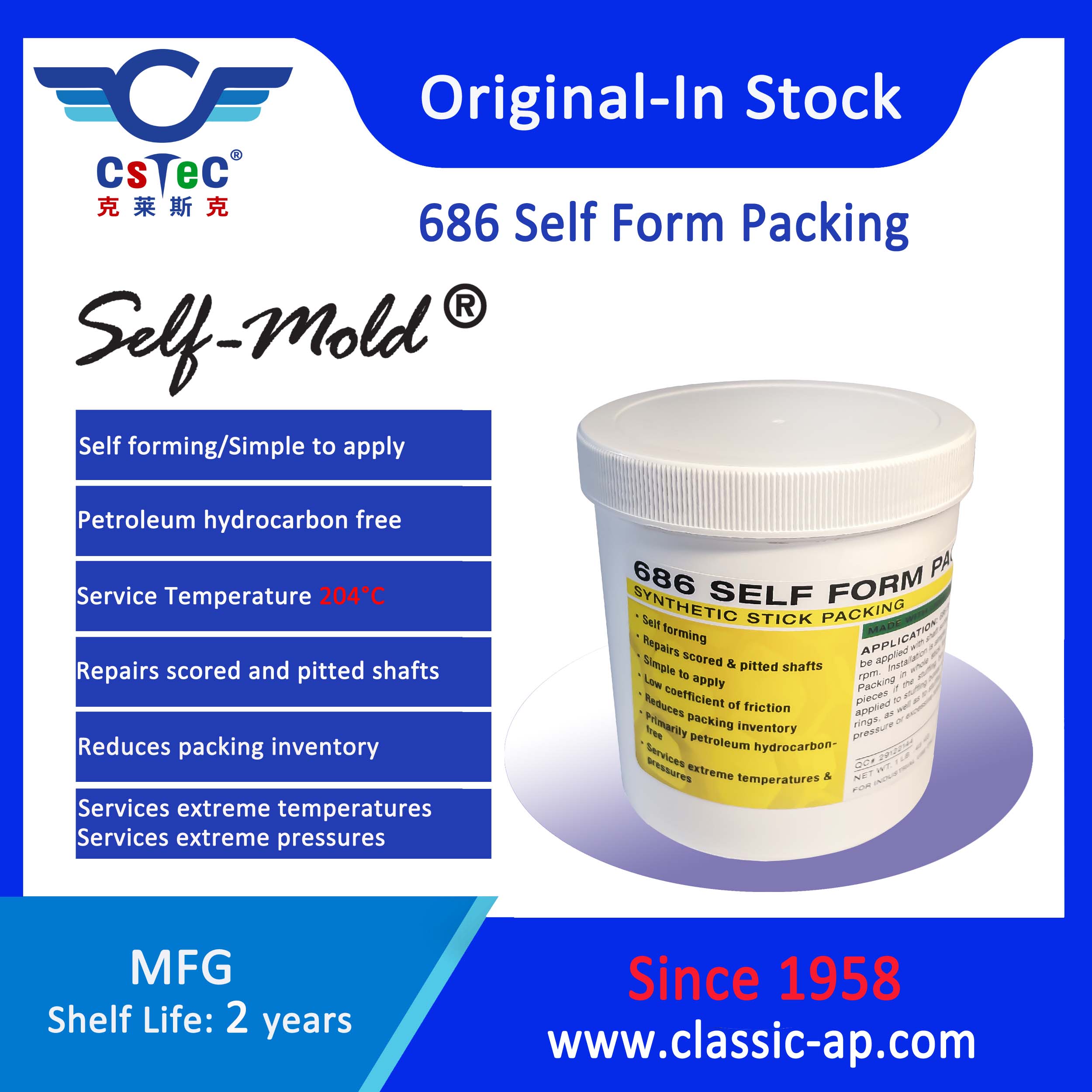 Self-Mold 686 Self Form Packing can be used as a supplement to worn conventional packing or intervals with conventional packing.Self-Mold 686 Self Form Packing services temperatures to 400°F (204°C) and pressures up to 10,000 psi.Self-Mold 686 Self Form Packing is unaffected by most acids, oils, caustics, and common solvents.