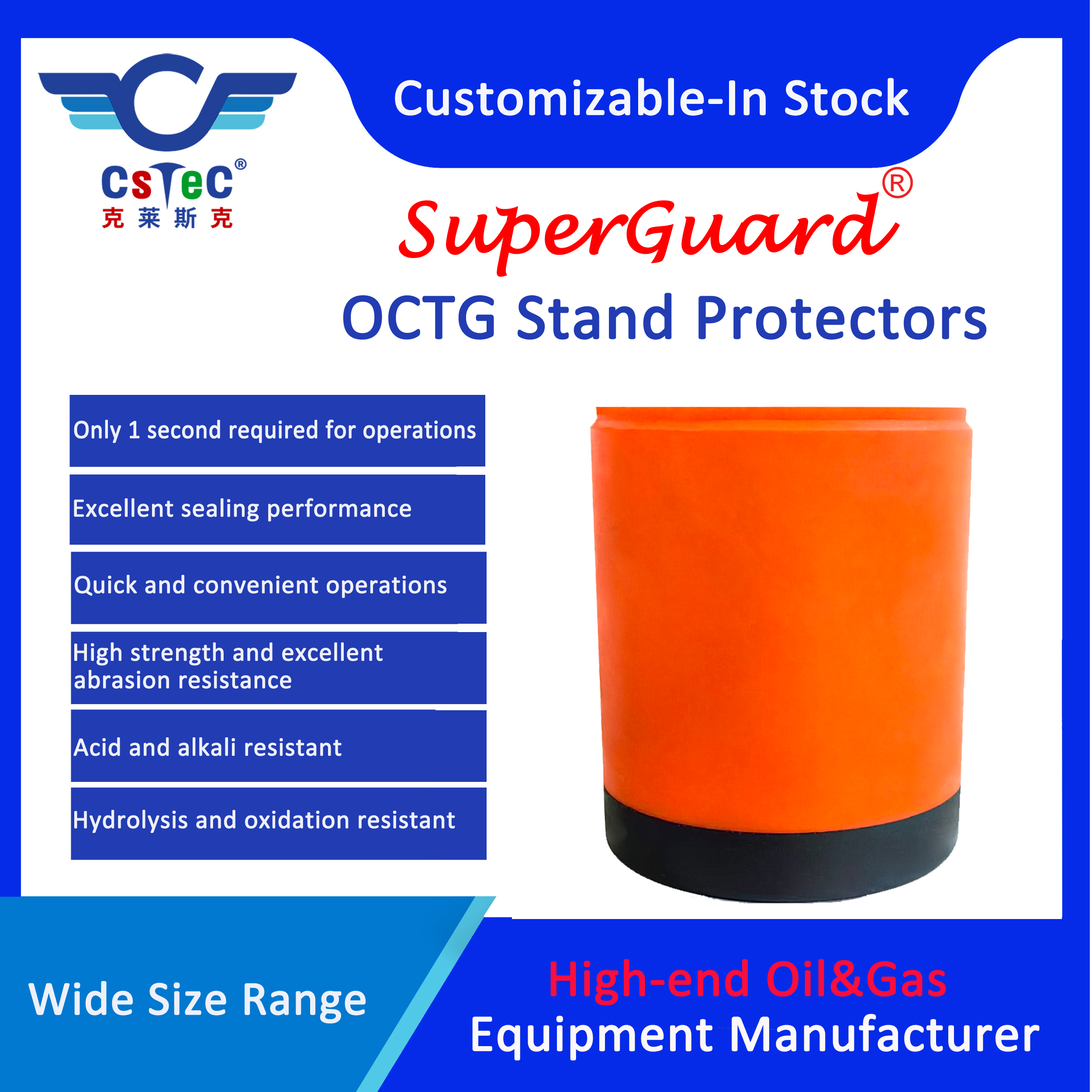 SuperGuard Quick OCTG stand protector is compatible with tubing and casing within the wide range of 3-1/2’’ – 20’’. It also supports customization for individual special sizes and specifications.