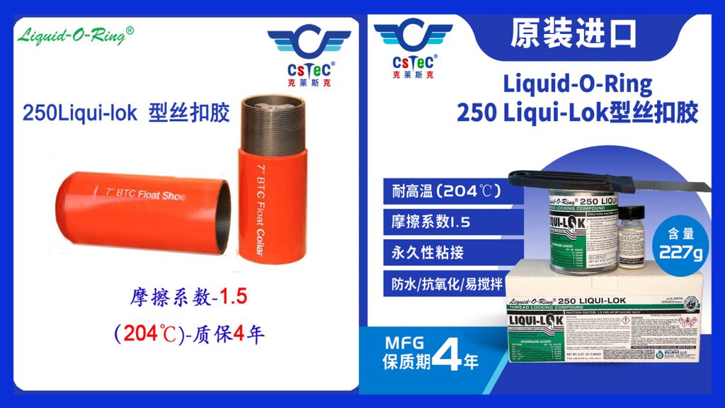 Liquid-O-Ring品牌250 Liqui-Lok型丝扣胶是一款适用于石油天然气行业的由两个套件组成的环氧树脂胶套装产品,其被设计用以替代在特定工况下所需的对于套管接头以及其它相关丝扣连接接头的焊接作业。Liquid-O-Ring 250 Liqui-Lok型丝扣胶产品工作性能稳定,不受振动,敲击以及温度变化造成的膨胀等因素的影响。Liquid-O-Ring 250 Liqui-Lok型丝扣胶产品可以承受较高的卸扣扭矩的反作用力,从而为所粘接部件提供了一层良好的防漏密封。即使在温度变化的工作环境下,Liquid-O-Ring 250 Liqui-Lok型丝扣胶产品也很容易被搅拌调配,因为Liquid-O-Ring 250 Liqui-Lok型丝扣胶的产品设计中充分考虑了即使静置超过一个小时也可以保持其粘稠度的现场应用情况。
