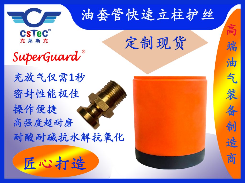 SuperGuard品牌油套管快速立柱护丝是一款由克莱斯克CsTeC公司自主研发的创新型高端油套管用护丝产品,其适用于石油天然气行业油田现场油套管双根以及三根连接作业。SuperGuard品牌油套管快速立柱护丝是国内首款气胀式立柱护丝产品,克莱斯克CsTeC公司拥有此产品的独家知识产权以及专利权。SuperGuard品牌油套管快速立柱护丝由克莱斯克CsTeC公司整合业内顶级优质资源,融合最新科技元素,精心研制而成,主要设计应用于深水平台钻完井作业,其整体性能经综合验证达到国际领先水平。SuperGuard品牌油套管快速立柱护丝采用先进的快速充放气技术,可提供对于油套管公扣区域的防异物、防污染及抗冲击保护。SuperGuard品牌油套管快速立柱护丝的操作便捷,单个作业循环周期中的充放气环节各仅需1秒,从而极大地提升了油田现场的作业效率及安全性。SuperGuard品牌油套管快速立柱护丝同时具有高强度、超耐磨、耐酸耐碱、防紫外线、良好的绝缘性、抗水解、抗老化等性能,从而使其成为一款综合性能卓越的护丝类产品。