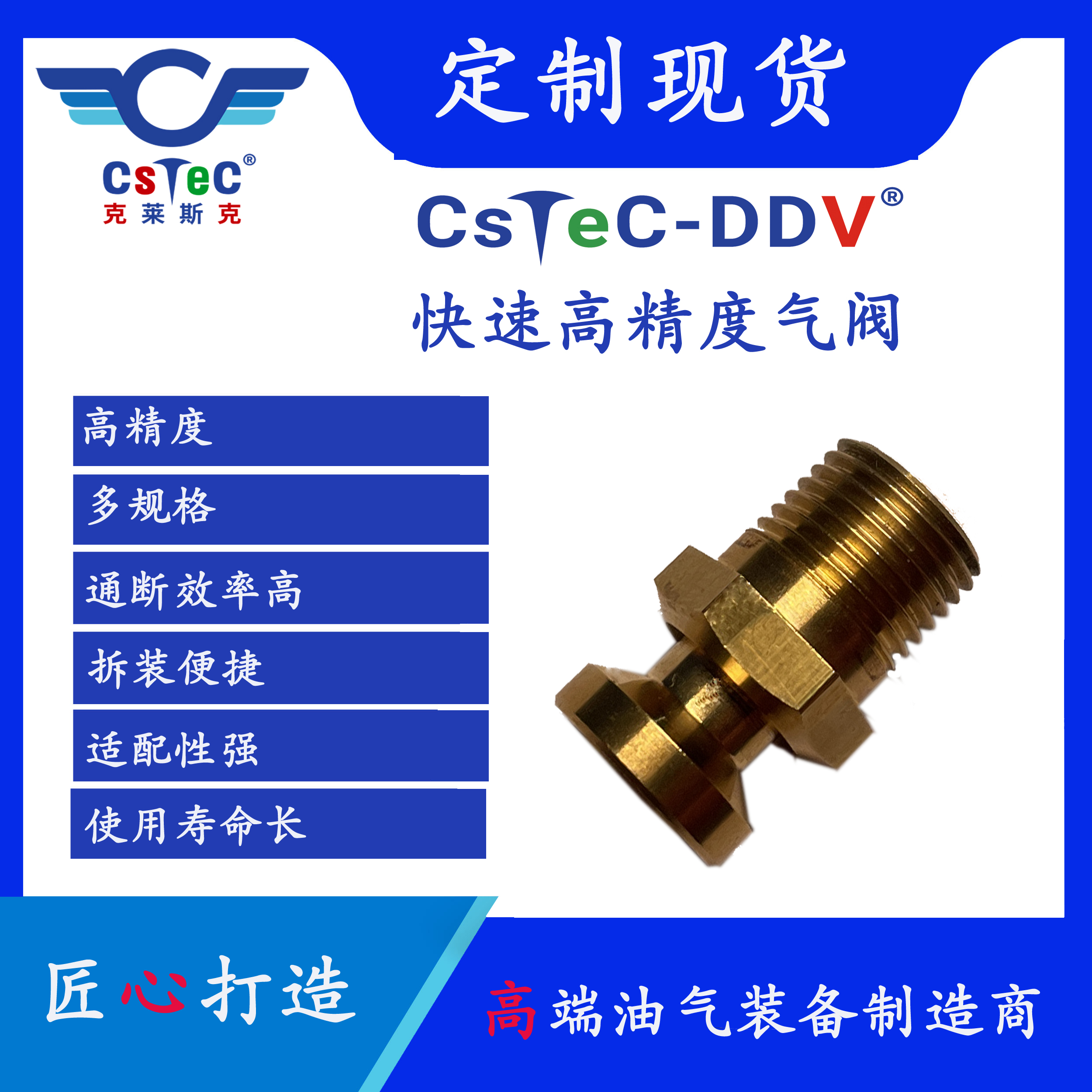 CsTeC-DDV品牌快速高精度气阀产品是一款适用于石油天然气以及其它工业领域等的通用型高精度气阀产品,可适配于各种气管道,动力设备以及定制产品中,起到快速通断气路的作用,具有通断效率高,拆装便捷,适配性强,性能稳定,使用寿命长等特点。CsTeC-DDV品牌快速高精度气阀产品由克莱斯克CsTeC科研团队根据市场需求,整合优质资源,坚持“高标准,严要求,国际化,多规格”等科研开发方向,积极探索,大胆创新,反复修正,融汇贯通,历时2个月自主研发而成。CsTeC-DDV品牌快速高精度气阀产品的成功研制是克莱斯克CsTeC科研团队在“小而精”产品科研方向上的又一次里程碑式突破,将为克莱斯克CsTeC后续其它相关延伸产品的研发奠定坚实的基础。经相关产品适配测试验证,CsTeC-DDV品牌快速高精度气阀产品的整体性能达到国际先进水平。CsTeC-DDV品牌快速高精度气阀产品可兼容适配克莱斯克CsTeC科莱普品牌油套管快速气胀护丝以及SuperGuard品牌油套管快速立柱护丝产品。CsTeC-DDV品牌快速高精度气阀产品目前已进入批量生产阶段。
