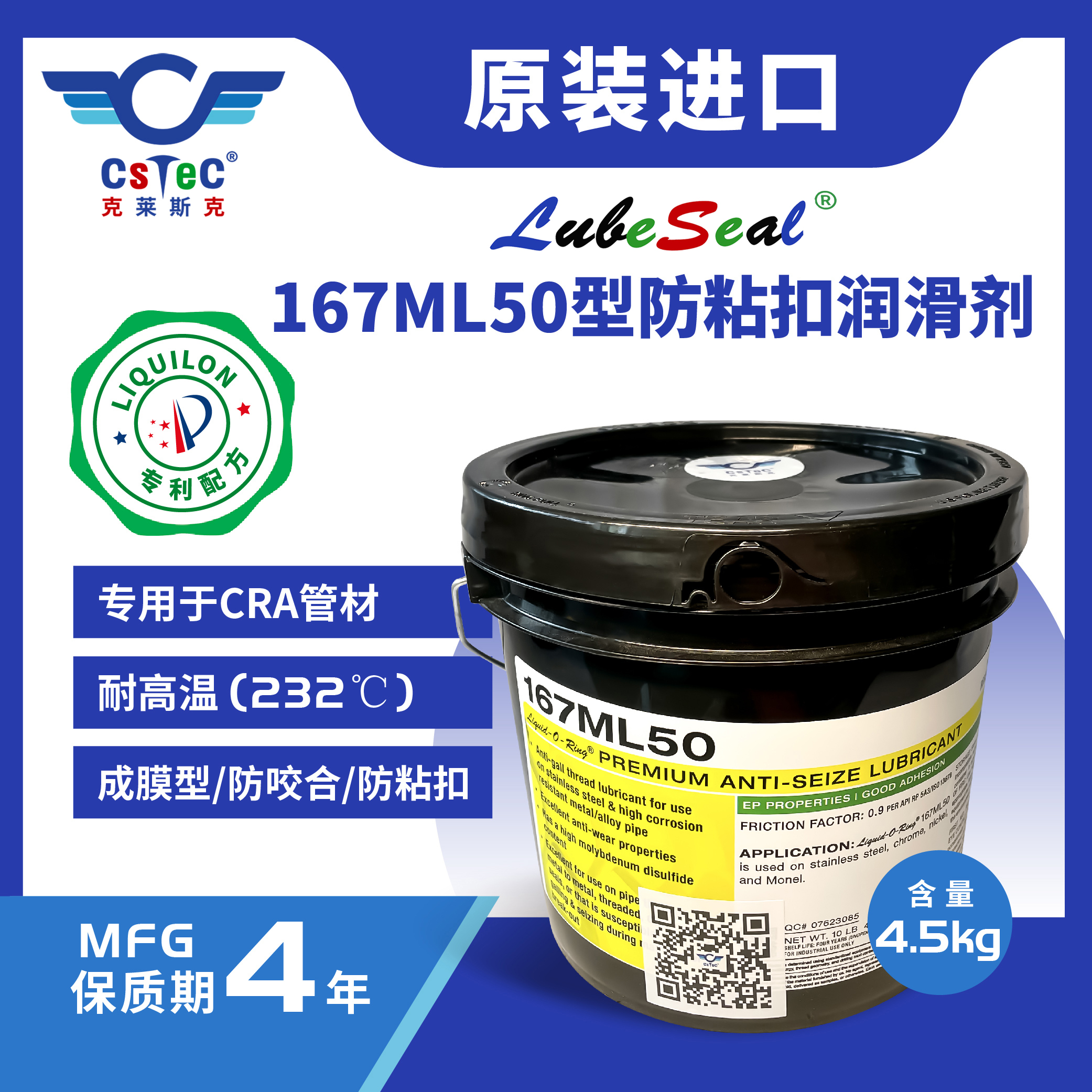 LubeSeal品牌167ML50型深水高温CRA管材专用防粘扣润滑剂是一款适用于石油天然气行业的被设计用在不锈钢以及耐重腐蚀金属或者合金管材上的特定专用防粘润滑剂产品,这些合金管材的材质包括铬,镍和蒙乃尔等。由于其组成成分中二硫化钼含量较高,LubeSeal品牌167ML50型深水高温CRA管材专用防粘扣润滑剂非常适合用在具有特殊的金属-金属扣型或者台肩密封的管材上,或者在上卸扣过程中易受粘扣影响的管材上。LubeSeal品牌167ML50型深水高温CRA管材专用防粘扣润滑剂也是一款成膜型润滑剂,通常用在有精密公差要求的工况下。